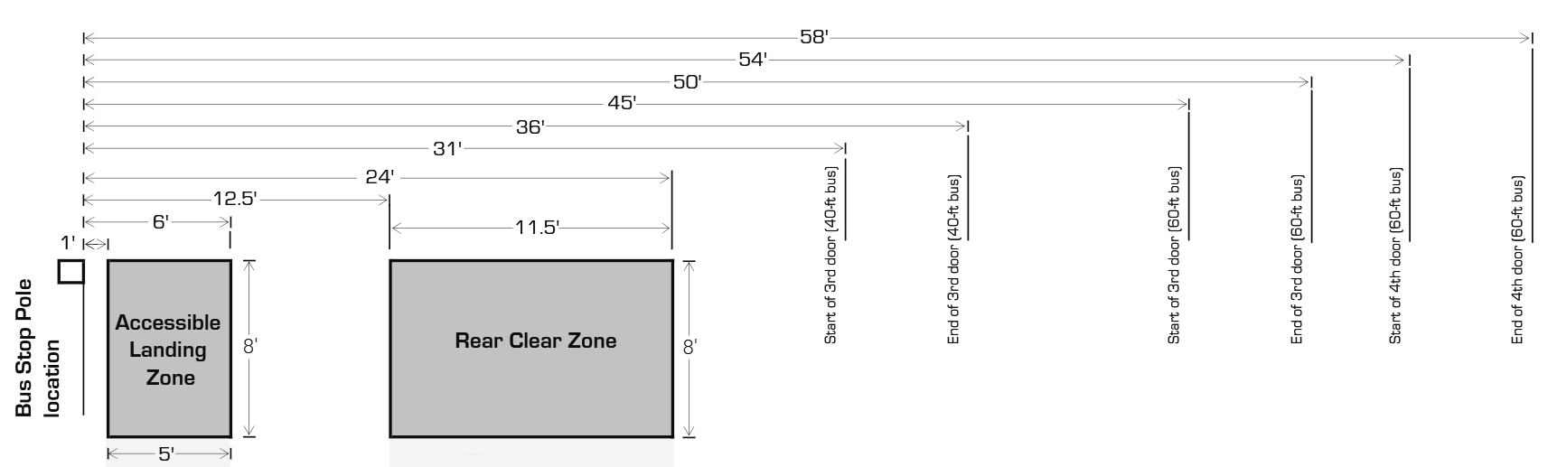 | AC Transit’s Accessible Landing Zone and Rear Clear Zone diagram from page 18 of their 2018 Multimodal Corridor Guidelines (full image). |